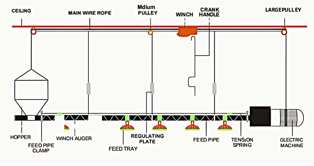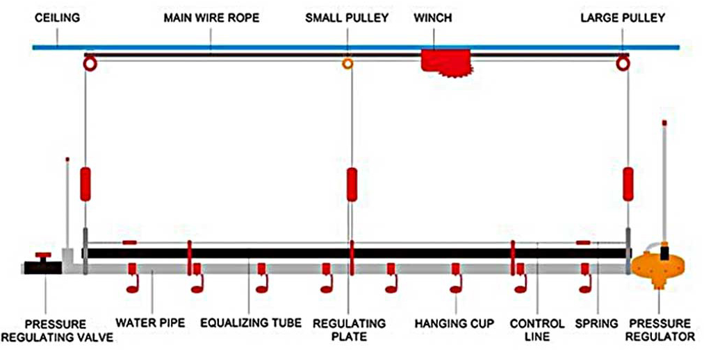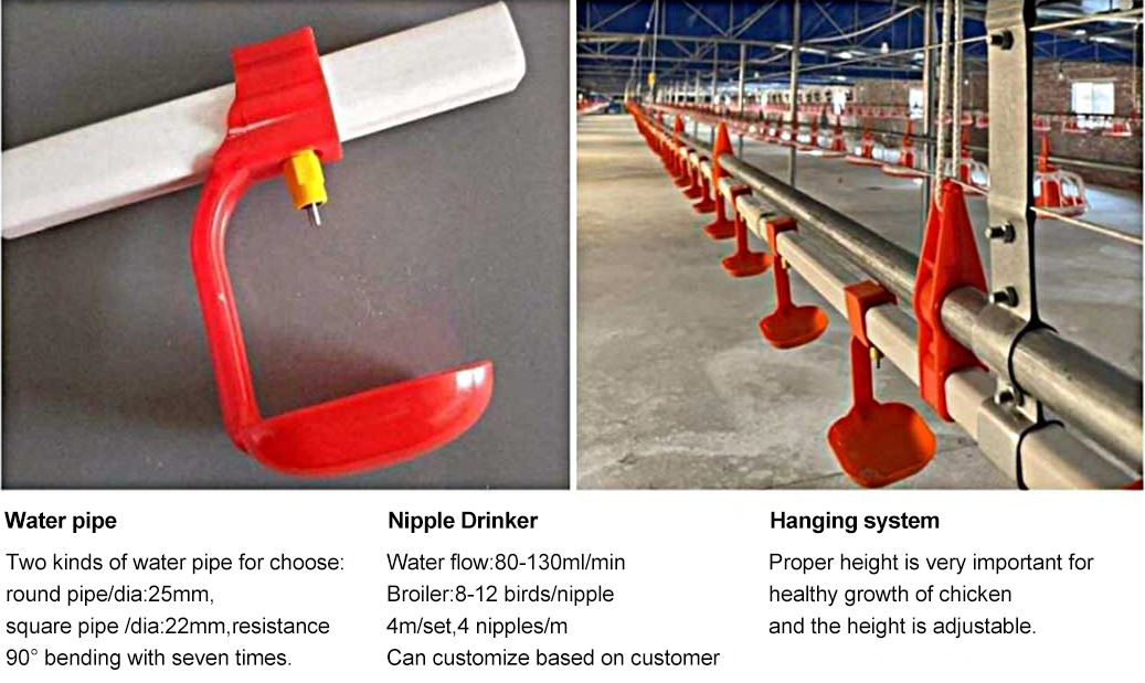 The automatic water line system is composed of pressure regulator, water pipe,drinker, balance pipe, anti-perch line, winch,waterline lifting system and so on. It can ensurethe fresh water supply,eliminate external pollution,improve the survival rate of chickens,save more water and save manpower, and meet the requirements of different age ofchickens.